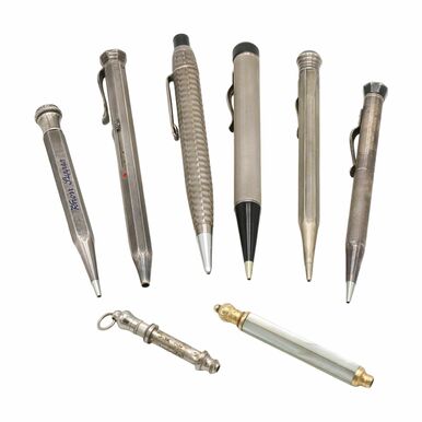 fünf Kugelschreiber in Silberhüllen, punziert mit Feingehaltsmarken (935, 925 sowie 835), drei Drehbleistifte u.a. mit Perlmuttermantel, ohne Marken, altersgemäßer, gebrauchter Zustand, L. bis 13 cm cm