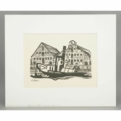 (1901 - 1943), Linolschnitt/Papier, unten links in der Platte signiert, Kapitän auf einem Schiff vor Lagerhäusern an der Oder, altersgemäß guter Zustand, leicht angegilbt und lichtrandig, Darstellung 15 x 23,5 cm (HxB), Passepartout, Gesamtmaß 34,5 x 41,5 cm (HxB)