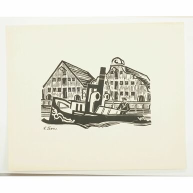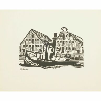 Julo Levin, "Schlepper 'Werner' vor Giebelspeicher in Stettin"