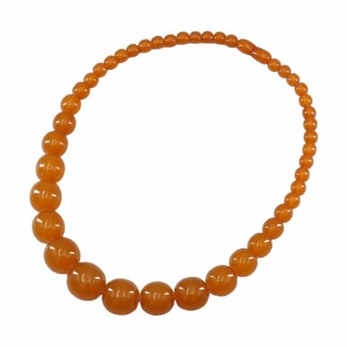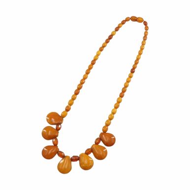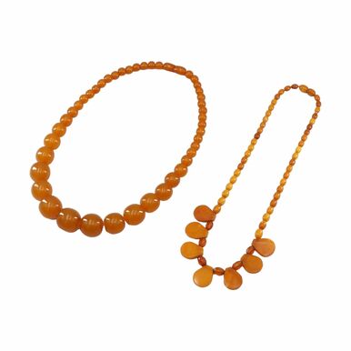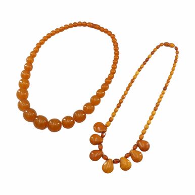 Schraubverschluss, altersgemäß guter Zustand 1) Collier mit polierten runden Butterscotch-Bernsteinperlen im Verlauf auf Faden gezogen, L. 49 cm 2) Collier mit polierten ovalen Butterscotch-Bernsteinperlen auf Faden gezogen, zusätzlich größere Elemente als kleine Plaketten geformt, dazwischen ovale facettierte Perlen aus klarem Bernstein, könnte neu aufgezogen werden, L. ca. 45 cm