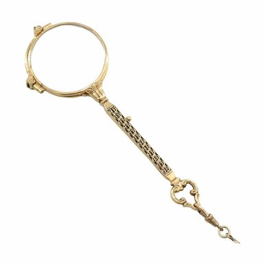 Metall vergoldet, altersgemäßer Zustand, Vergoldung teilweise beschädigt 1) Lorgnette, Klappbrille, Griff durchbrochen gearbeitet, reich verziert, H. 12,5 cm 2) flache Panzerkette für Taschenuhren mit Frackknopf, Kette mit Knicken, L. 27 cm