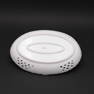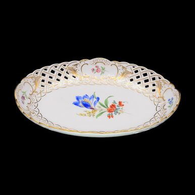 Porzellan, 1. Wahl, Blume 3, Mitte, bunt, Goldrand, im Boden Schwertermarke, Rand mit Gitterdurchbruch, Schilderornamente goldstaffiert, sehr guter Zustand, 4 x 25 x 17 cm (HxBxT)