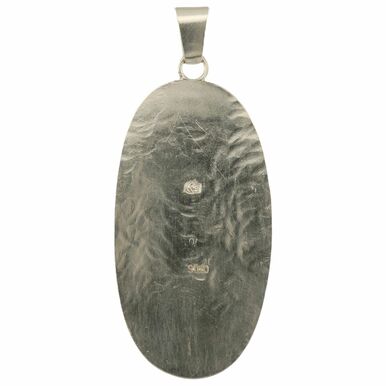 900/- Silber, Fassung mit runden Drahtauflagen, zentrales erhabenes Element mit Emaille von innen nach außen vom Grün ins Blau übergehend auf kariertem Untergrund, darauf die vier kleinen Türkise aufgebracht, altersgemäß sehr guter Zustand, H. mit beweglicher Öse 6,4 cm