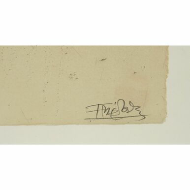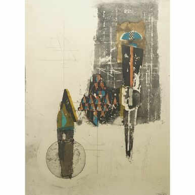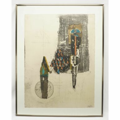 (1912 - 1992), Farblithografie/Papier, unten rechts signiert, unten links auflagenbezeichnet Exemplar 55/95, schwarze Formen und Flächen mit blauen und braunen Akzenten, altersgemäß guter Zustand, Darstellung 76,5 x 57 cm (HxB), hinter Glas, gerahmt, Gesamtmaß 91,5 x 71,5 cm (HxB)