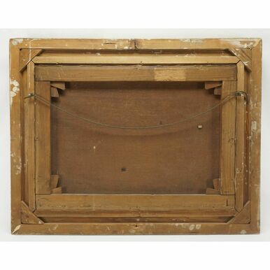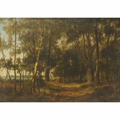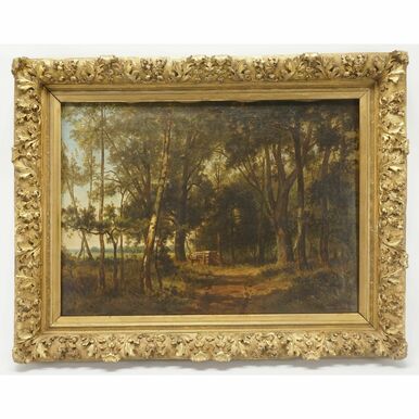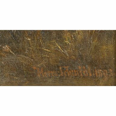 Öl/Leinwand, unten rechts signiert und datiert, 1893, Verso auf Etikett bezeichnet, Waldrand mit Rehen, altersgemäßer Zustand, Krakelee, Retuschen über kleinen hinterlegten Partien in der Leinwand, Darstellung 47 x 66 cm (HxB), goldfarbener Rahmen, Rahmen bestoßen, partiell retuschiert, Rahmenbreite 9 cm
