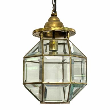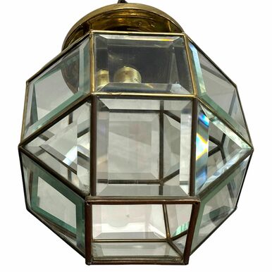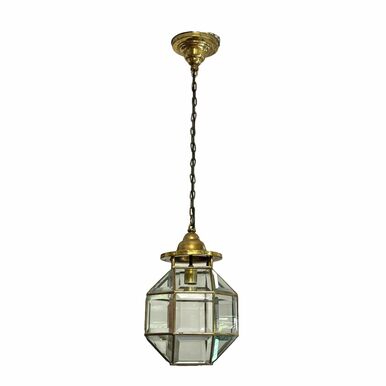 nach dem Entwurf von Adolf Loos, Wien, Hängeleuchte mit facettiert geschliffenen Klarglasscheiben, eingefasst von einem oktagonalen Messinggestell, Kettenaufhängung, altersgemäßer Zustand, Gebrauchsspuren, partiell Abplatzungen am Glas innen, E 27 Fassung, ohne Aufhängung 42 x 29 x 29 cm (HxBxT), Abhängung 103 cm