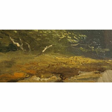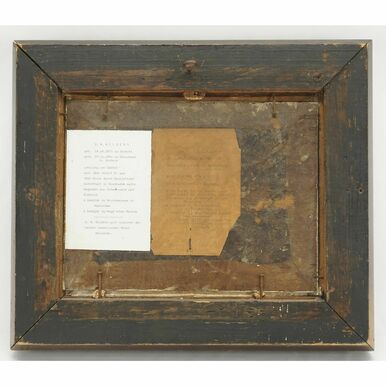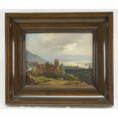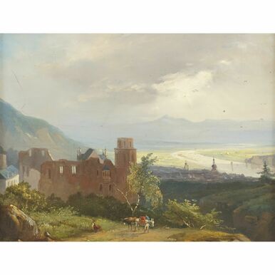 niederländischer Landschaftsmaler (1811 Utrecht - 1890 Oosterbeek), Öl/Holzplatte, unten rechts signiert und datiert, 1876?, Verso bezeichnet, romantische Landschaft, zwei Personen mit Eseln am Heidelberger Schloss, das sich über die Stadt am Neckar erhebt, altersgemäßer Zustand, angeschmutzt, oberflächliche Kratzer, Dellen in der Farbschicht und kleinere Farbfehlstellen vor allem im rechten oberen Bereich, Darstellung 22,5 x 29,5 cm (HxB), gerahmt, Rahmen leicht bestoßen, Rahmenbreite 8 cm