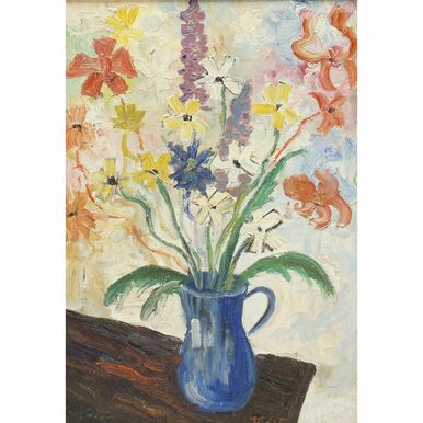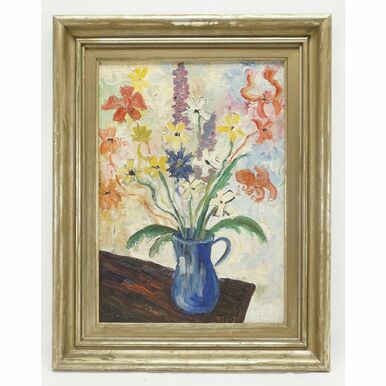 Öl/Leinwand, 20. Jh., pastose Blüten in verschiedenen Farben mit langen Stängeln in einer blauen Henkelvase breit aufgefächert, altersgemäßer Zustand, partiell Farbfehlstellen, Krakelee, angeschmutzt, Darstellung 46 x 33 cm (HxB), gerahmt, Rahmen leicht bestoßen, Rahmenbreite 7 cm