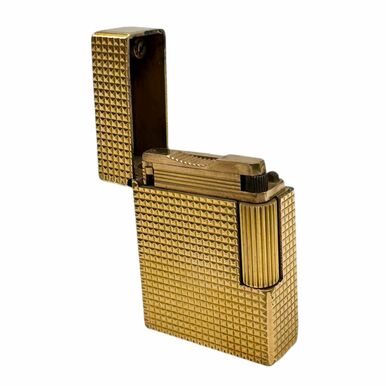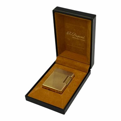 Buntmetall, vergoldet, Boden bez. "S.T. Dupont PARIS MADE IN FRANCE", Exemplar 81EEA43, hochrechteckige Form, Dekor Pointe de Diamant, in der originalen Dupont Schatulle, altersgemäßer, gebrauchter Zustand, 4,6 x 3,5 x 1,3 cm (HxBxT)