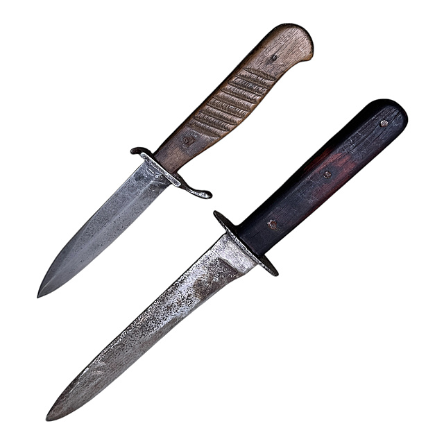 Stahl, geschmiedet, Holzgriffschalen. Ein Konvolut von zwei authentischen Grabendolchen aus dem Ersten Weltkrieg. 1) Deutscher Grabendolch (Privatbeschaffung). Ein typischer privat beschaffter Kampfdolch für deutsche Soldaten. Die Klinge ist einschneidig, der Griff besteht aus geriffelten Holzgriffschalen. Charakteristisch ist die S-förmig geschwungene Parierstange. Originaler Fundzustand, L. 23,5 cm, Klingenlänge 12 cm. 2) Österreichischer Grabendolch M1917. Ein offizielles Modell der k.u.k. Armee. Kräftige Klinge. Der Griff besteht aus zwei glatten, dunklen Holzgriffschalen, die mit drei Nieten befestigt sind, und einer ovalen Parierstange. Originaler Fundzustand, L. 30 cm, Klingenlänge 18 cm.