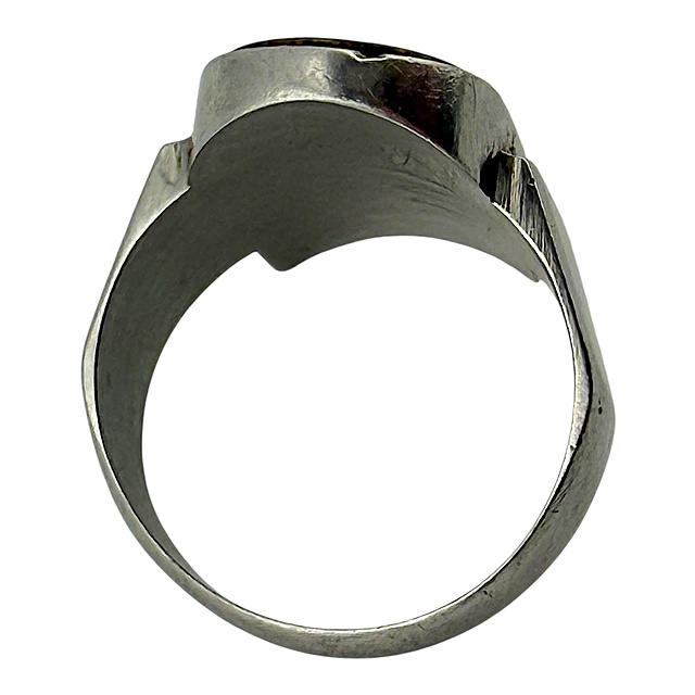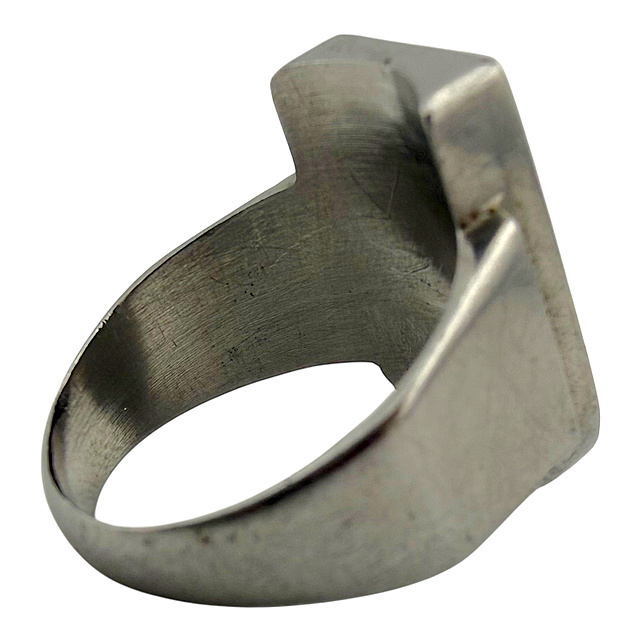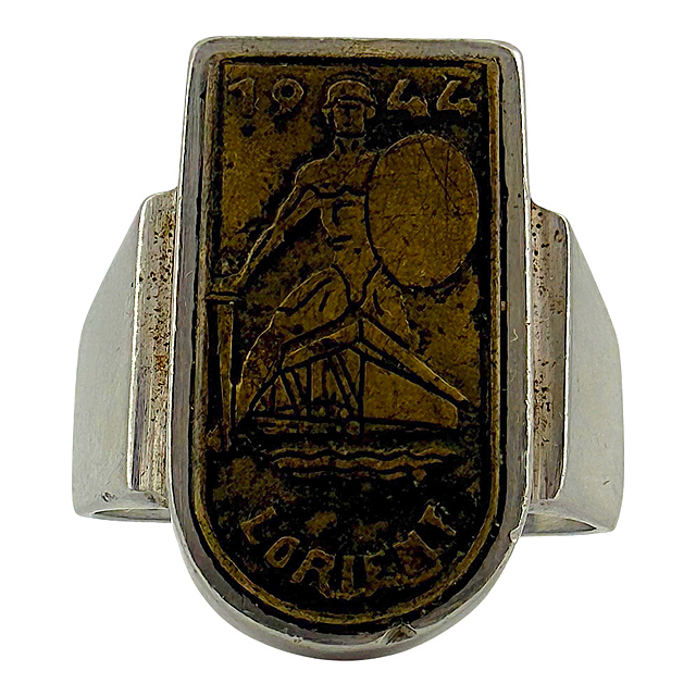 Edelstahl mit Bronze- oder Messing-Inlay. Ein seltener, handgefertigter Erinnerungsring aus der Zeit des Zweiten Weltkriegs, sogenannte Grabenkunst. Die große, schildförmige Ringplatte trägt die Inschrift „1944 LORIENT“ und zeigt einen antiken Krieger mit Schild und Schwert, der auf einem U-Boot-Turm steht. Die massive Ringschiene ist schlicht und geometrisch gehalten, altersgemäß guter, getragener Zustand mit authentischer Patina, Innendurchmesser 22 mm (entspricht Ringgröße 69), G. 10,3 g