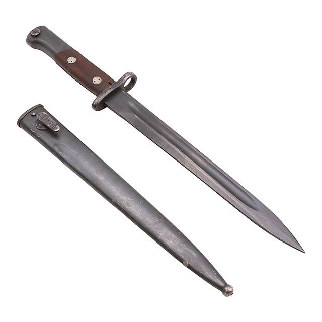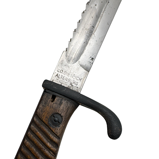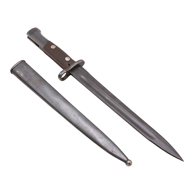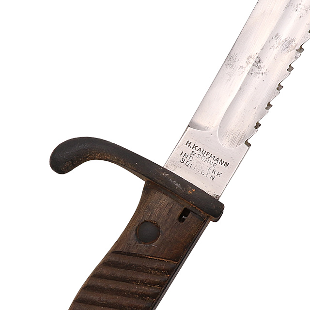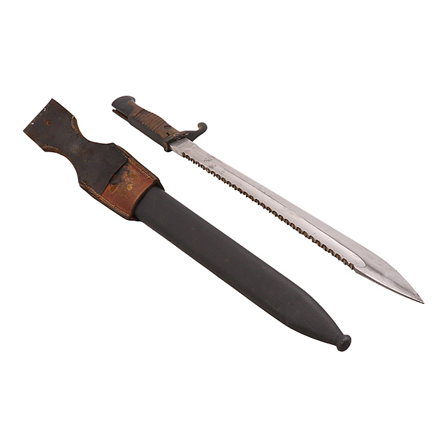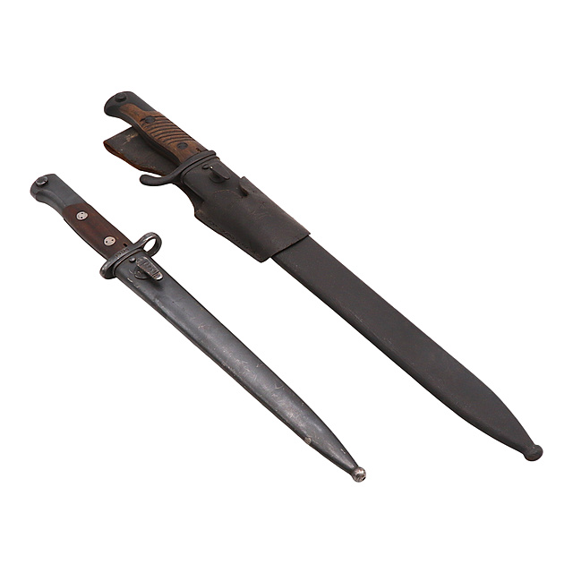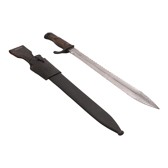 Stahl, geschmiedet, Holzgriffschalen, Stahlscheide, Leder. Ein historisches Konvolut von zwei Standard-Bajonetten aus den beiden Weltkriegen. 1) Seitengewehr 98/05 mit Sägerücken („Butcher Blade“), I. Weltkrieg. Ein wuchtiges Bajonett für das Gewehr 98, in der selteneren Ausführung mit Sägerücken für Pioniere und Unteroffiziere. Herstellermarke auf der Fehlschärfe Heinrich Kaufmann & Söhne Indiawerk Solingen. Mit originaler Stahlscheide und Koppelschuh aus Leder. Die Scheide wurde nachlackiert, L. 50 cm, Klingenlänge 36,5 cm. 2) Ausländisches Bajonett, II. Weltkrieg. Es handelt sich um ein nummerngleiches Stück aus Arsenalbeständen. Hersteller unleserlich, mit originaler Stahlscheide. Wohl aus Bulgarien oder Österreich, L. 38 cm, Klingenlänge 25 cm. Beide Stücke in altersgemäß gutem, getragenem Zustand mit authentischer Patina.