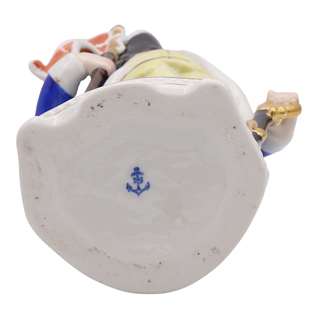 Porzellan, im Boden gemarkt, Fein ausgearbeitete Figur eines englischen Soldaten, stehend auf einem naturalistischen Sockel mit Baumstamm und Goldverzierungen. Der Soldat hält eine rote Fahne und trägt eine detailliert gestaltete Uniform mit blauem Rock, weißem Revers, gelber Hose, hohen schwarzen Stiefeln und einem schwarzen Dreispitz-Hut. An der Seite hält er einen Säbel mit vergoldetem Griff, altersgemäß guter Zustand, 25 x 11 x 7 cm (HxBxT)