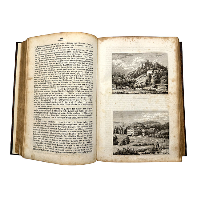 1845, zweite, durch Nachträge berichtigte Ausgabe, Beschreibung von Sachsen und der Ernestinischen, Reußischen und Schwarzburgischen Lande, mit 192 Ansichten und einer Höhen-Karte des Königreichs Sachsen und des anstossenden Theiles von Böhmen, altersgemäßer Zustand, stockfleckig, partiell leichte Randläsuren, teilweise Anmerkungen mit Bleistift, Einband erneurt, 800 Seiten, H. H. Grimm, Dresden