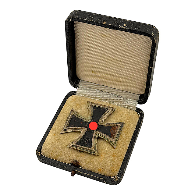 Ein historisches Konvolut von zwei deutschen Auszeichnungen aus der Zeit des Zweiten Weltkriegs. 1)Eisernes Kreuz 1. Klasse (1939) im Originaletui. Dreiteilige Fertigung mit geschwärztem Eisenkern und Silberzarge. Rückseitig an der Nadel punziert mit „20“ und „L/52“ für den Hersteller C. F. Zimmermann, Pforzheim. 2) Kriegsverdienstkreuz 2. Klasse mit Schwertern (1939). Bronze. Beide Stücke in altersgemäß gutem Zustand. Das Eiserne Kreuz mit leichtem Rostansatz und im originalen Verleihungsetui.