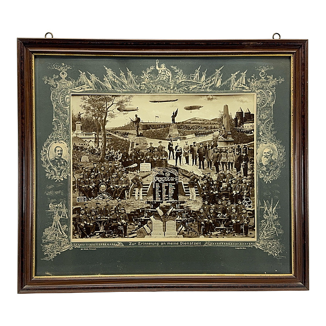 Historische Fotomontage eines Reservistenbildes, auf Untersatz montiert, Die sorgfältig arrangierte Komposition zeigt Reservisten in Paradeuniformen, als Attribute Reservistenpfeifen und Bierhumpen, vor militärischen Denkmälern und Landschaftskulissen, mit drei Luftschiffen am Himmel, der Untersatz rahmt das Foto mit ornamentalen, patriotischen Symbolen des Deutschen Kaiserreichs, auf dem Untersatz unterhalb der Darstellung bezeichnet "Zur Erinnerung an meine Dienstzeit" und Jul. Eilrich, Photograph, Longeville-Metz, altersgemäß gute Erhaltung, Foto leicht berieben und knickspurig, Untersatz berieben, Darstellung 38,5 x 48,5 cm (HxB), hinter Glas, gerahmt, Gesamtmaß 69,5 x 77 cm (HxB)