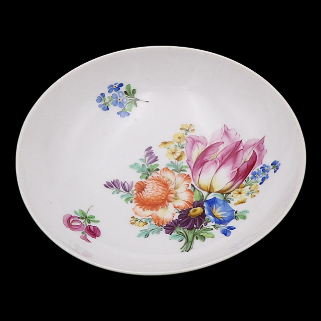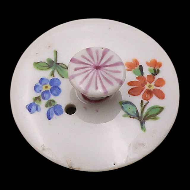 Porzellan 1) Mokkakanne mit Blumenmalerei, 1815 - 1923, im Boden Knaufschwerter, mit Schwanenhalshenkel, altersgemäßer Zustand, Deckel mit Glasurfehlern, Ausgießer bestoßen, Spannungsrisse, kleine Brandfehler und minimaler Farbabrieb, H. 20 cm 2) Kleiner Teller Marcolini, 1774-1815, Blumenbukett und gestreute Blumen, weißer Rand, im Boden Schwertermarke mit Stern, altersgemäß guter Zustand, kleine Brandfehler, 3 x 13,5 cm (HxD)