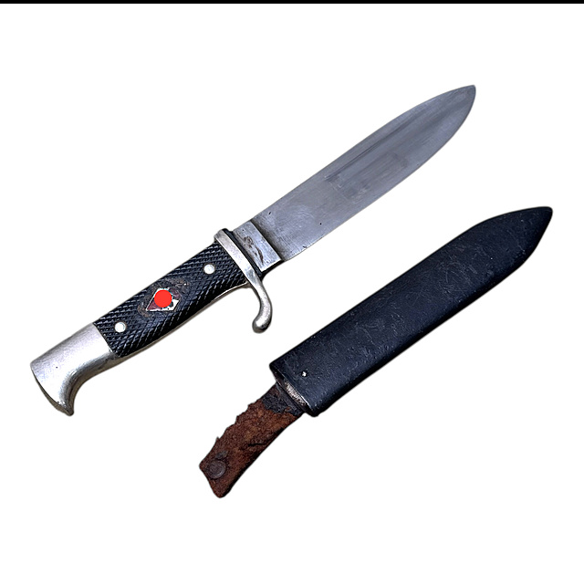 Stahl, vernickelt, Bakelit, Leder, emailliertes Abzeichen. Ein originales HJ-Fahrtenmesser aus der Zeit des Dritten Reiches. Der Griff mit vernickelter Parierstange und Knauf sowie originalen, geriffelten Bakelit-Griffschalen. In die Griffschale ist das HJ-Emblem eingelegt welches aber stark beschädigt ist. Die Klinge ist mit dem RZM-Logo und dem Herstellercode „M7/33“ für F. W. Holler, Solingen, markiert. Dazugehörige, schwarz lackierte Stahlscheide mit angenieteter Lederschlaufe, altersgemäß getragener Zustand mit Patina, L. 24,5 cm, Klingenlänge 14 cm.