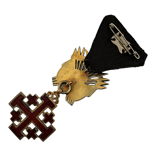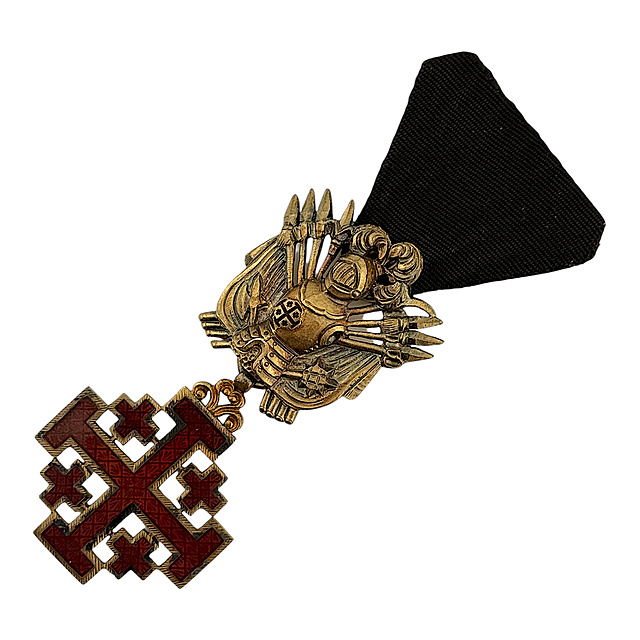 Der Ritterorden vom Heiligen Grab zu Jerusalem (Ordo Equestris Sancti Sepulcri Hierosolymitani, OESSH) ist einer der ältesten und zugleich höchsten Päpstlichen Ritterorden der katholischen Kirche. Er geht in seiner Wurzel auf die Zeit der Kreuzfahrer zurück und besteht in seiner heutigen Form seit dem 19. Jahrhundert unter dem Schutz des Papstes. Verliehen wird der Orden ausschließlich durch den Kardinal-Großmeister an Laien oder Geistliche, die sich durch besondere Verdienste um das Heilige Land, das christliche Leben und soziale Werke ausgezeichnet haben. Das sogenannte „Brustkreuz“ wird von Mitgliedern bei feierlichen Anlässen getragen und symbolisiert deren Zugehörigkeit zur weltweiten Ordensgemeinschaft. Das hier angebotene Exemplar stammt aus der Mitte des 20. Jahrhunderts und wurde durch das traditionsreiche Kölner Atelier Brückershohn gefertigt, das auf kirchliche Ausstattung und sakrale Insignien spezialisiert war. Es handelt sich um ein offizielles Verleihungsexemplar.