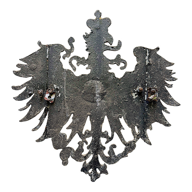 Aluminium, teils polychrom und goldfarben gefasst, Rückseite geschwärzt mit Befestigungsresten zweier Halterungen. Reliefplastisch gearbeitete Darstellung des preußischen Adlers mit bekröntem Haupt, gespreizten Flügeln und charakteristisch ausgeformtem Schwanzfederwerk. In den Fängen hält der Adler Zepter und Reichsapfel, auf der Brust prangt das vergoldete Monogramm „FR“ für Fridericus Rex, ein Attribut Friedrichs des Großen (1712–1786). Das Haupt ist von einer goldfarbenen Königskrone bekrönt, der Schnabel geöffnet mit rot bemalter Zunge. Flügel und Körper betont durch erhabene Linien und goldene Ornamentbänder, stilistisch an höfisch-militärische Embleme angelehnt, altersgemäßer, gebrauchter Zustand, teilweise berieben, 38 x 36 cm (HxB)