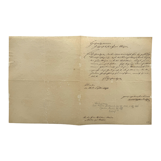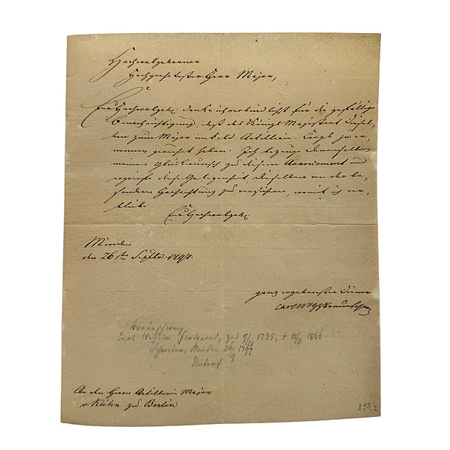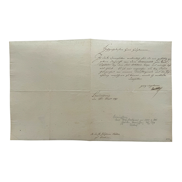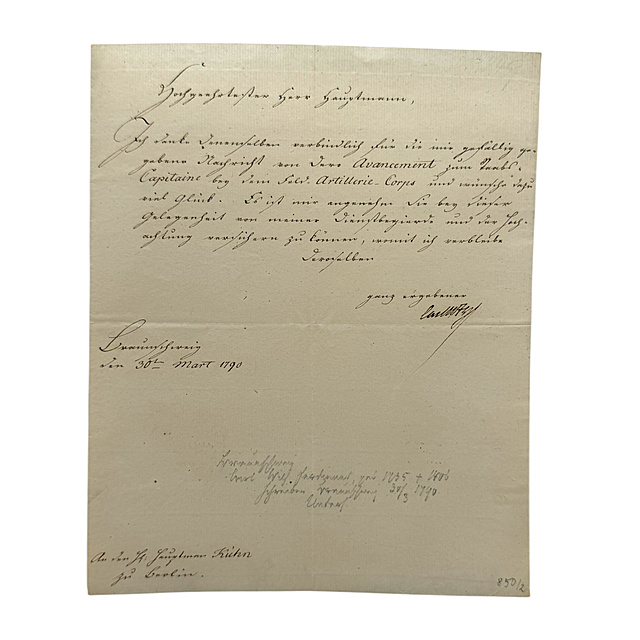 zwei Dankesschreiben mit eigenhändiger Unterschrift von Herzog Carl Wilhelm Ferdinand von Braunschweig-Wolfenbüttel (1735-1806) an den Hauptmann von Kühn in Berlin, zum einen bedankt sich der Herzog bei Hauptmann Kühn für die Benachrichtigung seiner Beförderung zum "Staabs-Capitain" beim Feld-Artillerie-Corps, datiert Braunschweig, 30. März 1790, zum anderen bedankt sich der Herzog bei Hauptmann Kühn für die Benachrichtigung seiner Beförderung zum Major beim selben Corps, datiert Minden, 26. September 1797, je eine halbe Seite Büttenpapier beschrieben, je ca. 23 x 18,5 cm (HxB)