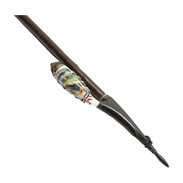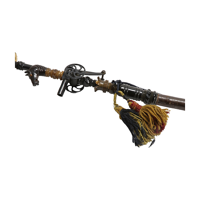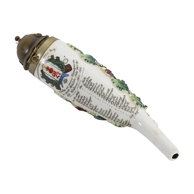 Porzellankopf, weiß, glasiert, en face ein reliefierter Kranz von Eichenlaub und Eicheln, mittig eine vielfigurige bunte Szene: Die Artillerie zieht ins Gefecht, rückseitig das Regimentsemblem sowie zwei Namensleisten, Pickelhaube als Deckel, überlanges Rohr aus Haselnuss, reich bestückt mit Schnitzerei aus verschiedenem Horn, zwei Troddeln, einer Kanone sowie einem Pferdekopf, altersgemäße Erhaltung, inklusive Schlauch L. 164 cm