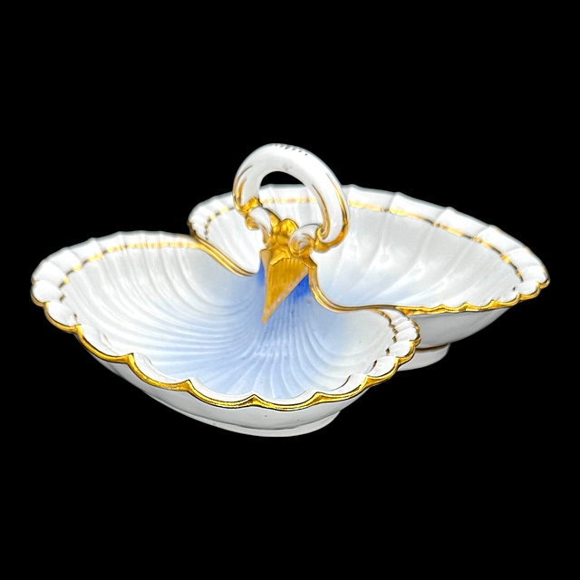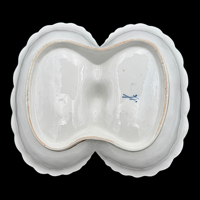 Porzellan, im Boden Knaufschwerter, in der typischen Form zweier symmetrisch angeordneter, muschelförmiger Schalen mit mittigem, geschwungenem Henkel. Das Dekor in zarten Blau- und Weißtönen verläuft sanft vom Zentrum nach außen, wodurch die reliefierte Muschelstruktur besonders hervorgehoben wird. Der Rand ist mit feiner Goldstaffage versehen, ebenso der Henkel mit plastisch gestalteten Voluten, altersgemäßer Zustand, Glasurfehler, Gold leicht berieben, 11,5 x 26,5 x 23 cm (HxBxT)