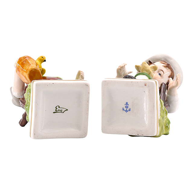 1) Porzellanfabrik Albert Stahl & Co. Rudolstadt Junge mit Küken, im Boden gemarkt, Porzellanfigur eines Jungen mit Trachtenhut und grün-rotem Kleidungsensemble, auf dem Knie ein Küken, Sockel in Rasenoptik, altersgemäß guter Zustand, partiell Glasurabplatzer, 12 x 6 x 5,5 cm (HxBxT) 2) Porzellanfabrik Karl Ens Volkstedt Mädchen mit Küken, im Boden gemarkt mit Ens-Schriftzug, Porzellanfigur eines Mädchens in traditioneller Tracht mit violetter Haube und grünem Schürzchen, ein Küken sitzt am Korbrand, Sockel mit Wiesenstruktur, altersgemäß guter Zustand, 13,5 x 6 x 5 cm (HxBxT)