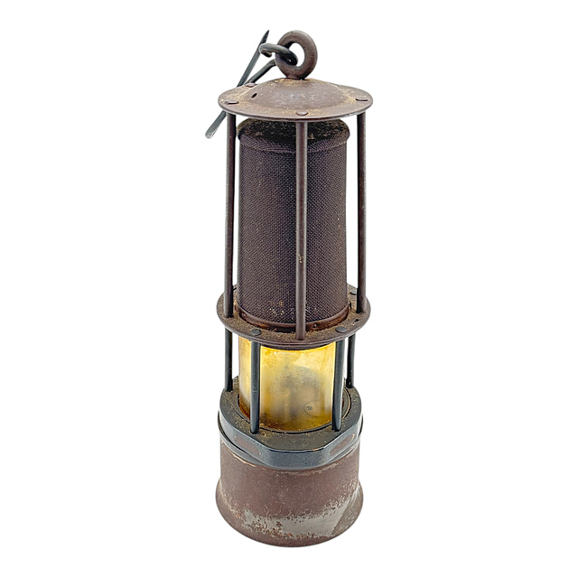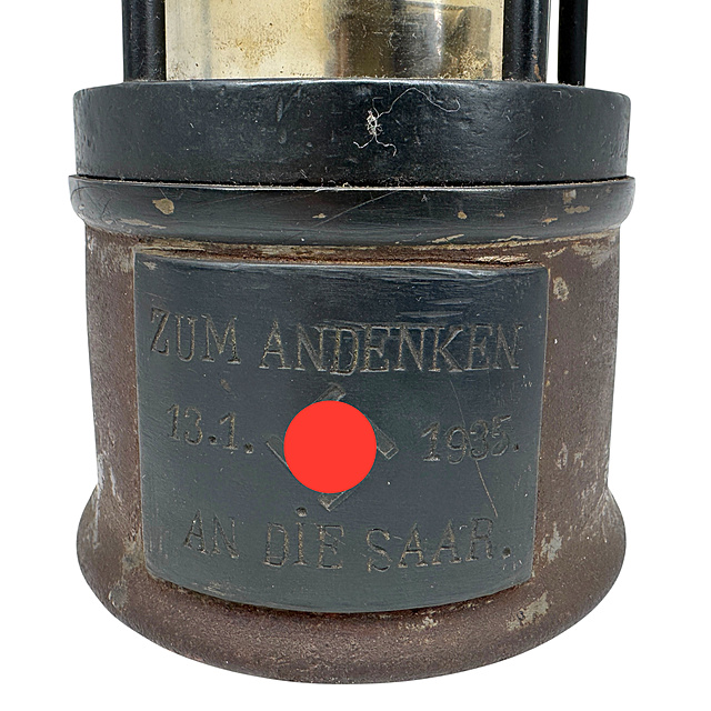 Eisen und Messing, Glas, mit aufgelegter Plakette. Eine authentische Gruben-Sicherheitslampe (Wetterlampe), die als Erinnerungsstück an die Saarabstimmung von 1935 modifiziert wurde. Auf dem unteren Teil der Lampe ist eine Plakette angebracht mit der Inschrift „ZUM ANDENKEN / 13.1. 1935 / AN DIE SAAR“ und einem zentralen Hakenkreuz. Die Lampe ist in der klassischen Bauweise mit Glaskolben, Drahtgaze-Korb und Tragehaken gefertigt, originaler Fundzustand mit starker, authentischer Rostpatina, H. 28 cm