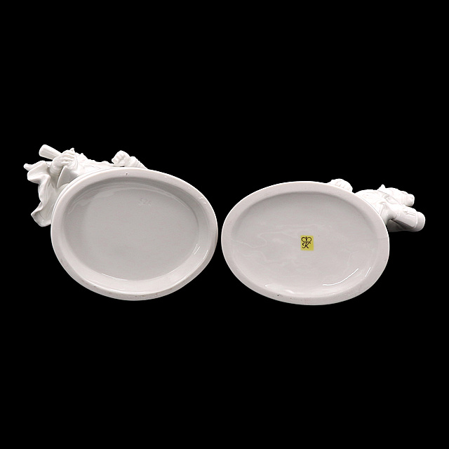 Weißporzellan. Ein Paar fein ausgeführter Soldatenfiguren aus Thüringer Porzellan, die Offiziere aus der Napoleonischen Zeit darstellen. Beide Figuren in altersgemäß gutem Zustand. 1) Ungemarkte Figur: Stehender Soldat in militärischer Uniform, seinen Mantel über die Schulter gelegt und seinen Helm in der Hand haltend. Der Helm ist mit Federschmuck und einem großen „N“ (für Napoleon) verziert. Vermutlich Thüringer Porzellan, 22 x 11,5 x 8,5 cm (HxBxT). 2) Figur von Rudolf Kämmer: Stehender Soldat in detailreicher Uniform mit Epauletten, an eine mit „MPG“ bezeichnete Säule gelehnt. Am Boden gemarkt (Rudolf Kämmer), 23,5 x 11,5 x 9 cm (HxBxT).