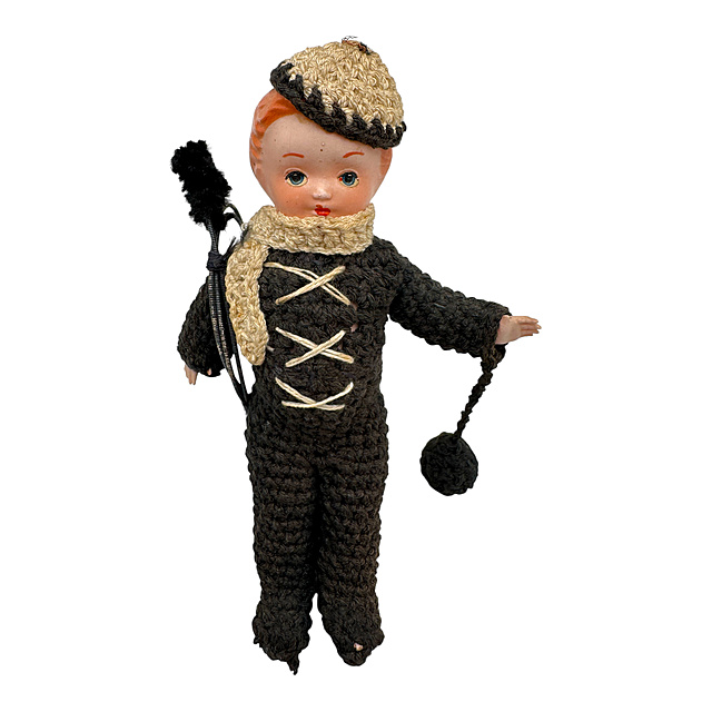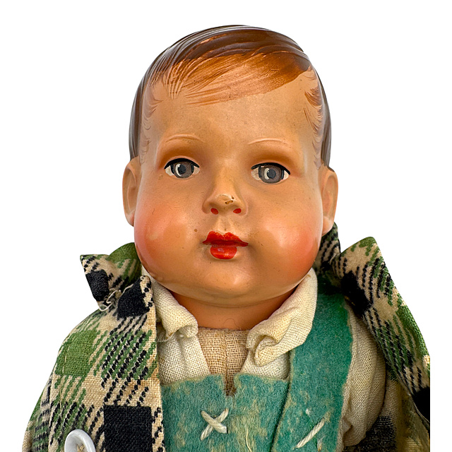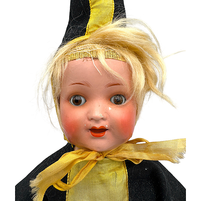 altersgemäßer bespielter Zustand 1) Heubach Köppelsdorf Puppenmädchen, Biskuitporzellan-Kopf, Massekörper, am Hinterkopf gemarkt "Heubach Köppelsdorf 342 9/0 Germany", Charaktermädchen mit geöffnetem Mund mit zwei Zähnen oben, braunen Schlafaugen und blonder Perücke, als Münchner Kindl gekleidet, Farbabplatzer am Kopf, Perücke mit Haarverlust, Körper mit Altersspuren, H. 38 cm 2) Kleiner Buschow & Beck Puppenjunge, Zelluloid-Kopf und -Hände, Stoffkörper, am Hinterkopf gemarkt mit Helmmarke und "Germany No 2 26", Junge mit modellierten braun gemalten Haaren und gemalten braunen Augen, in Trachtenkleidung, Kopf leicht angeschmutzt, Nasenspitze minimal gedellt, Körper fleckig, H. 26 cm 3) Kleine Puppe als Schornsteinfeger, Zelluloid, am Rücken gemarkt, Puppe mit modellierten rot gemalten Haaren und gemalten blauen Augen, der Kopf fest am Körper, Arme und Beine beweglich, in Schornsteinfeger-Kleidung eingehäkelt, aufgeklebter Hut, H. 15 cm