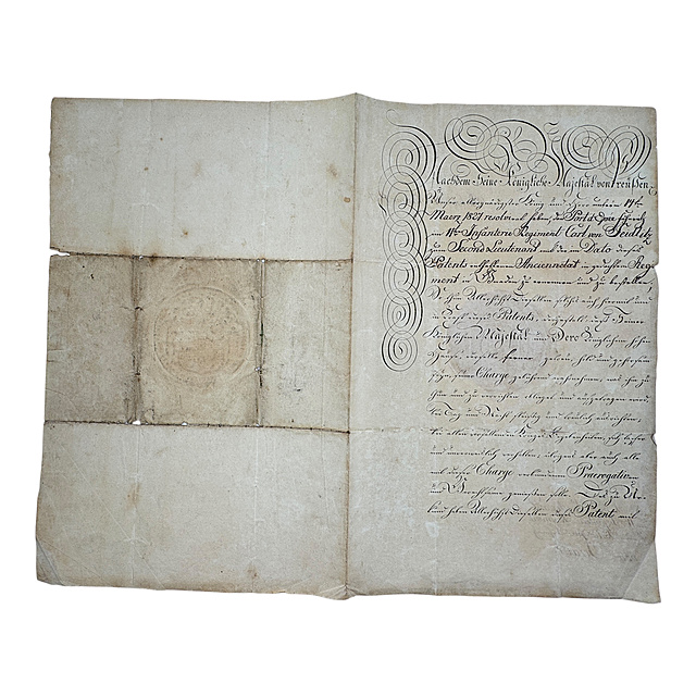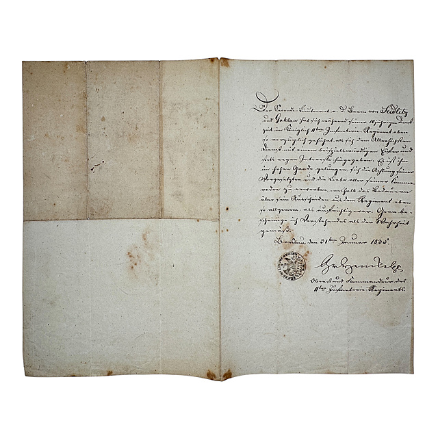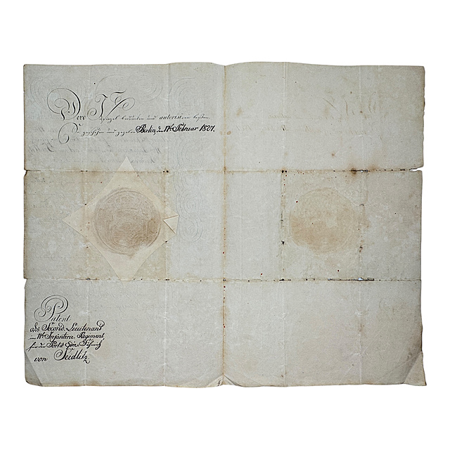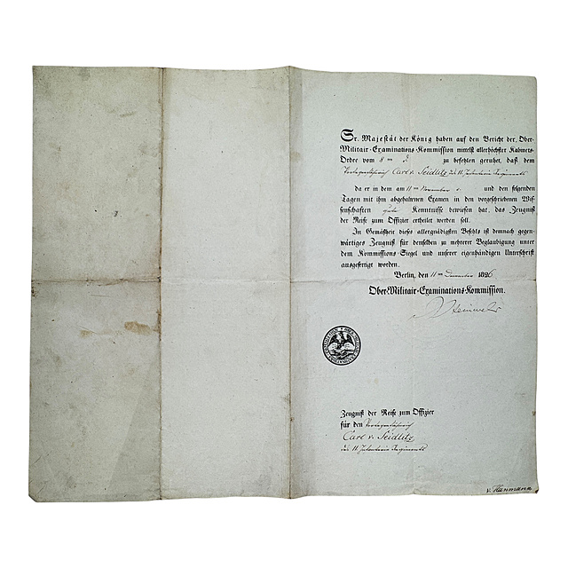 für den Second-Lieutenant Carl von Seidlitz im 11. Infanterie Regiment, großes Blindsiegel, dazu das Zeugnis der Reife zum Offizier 1826 von der Obermilitär-Examinations-Kommission, Unterschrift unleserlich und Beurteilung durch den Oberst und Kommandierenden des 11. Infanterie Regiments 1835, mehrfach gefaltet mit leichten Einrissen