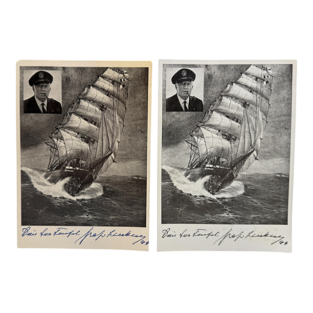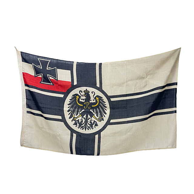 Dieses Ensemble ist ein seltenes Zeugnis des Lebens und Wirkens des berühmten Marineoffiziers Felix Nikolaus Alexander Georg Graf von Luckner (1881 Dresden – 1966 Malmö) und seiner tiefen Verbindung zur Stadt Halle. 1) Eine ausdrucksstark modellierte Zinkbüste des Grafen auf einem massiven Mineralsockel. Das Porträt zeigt ihn mit charakterstarken Zügen, tief gesetzten Augen und einer markanten Stirnpartie. Die Oberfläche besitzt eine authentische Alterspatina. Der Bildhauer ist unbekannt, es sind lediglich zwei Exemplare dieser Büste bekannt. Ein Exemplar befindet sich im Stadtarchiv Halle (Saale), das zweite ist das hier vorliegende Stück, altersgemäß guter Zustand, mit kleiner Beschädigung am Sockel, 40,5 x 19,5 x 24 cm (HxBxT), G. 12,7 Kg. 2) Dazu eine historische Reichskriegsflagge aus Baumwollgewebe mit einem eingenähten Befestigungsfaden. Laut Aussage des Einlieferer stammt die Flagge aus dem Nachlass der Mutter des Grafen in Halle (Saale) und soll von seinem legendären Hilfskreuzer SMS „Seeadler“ aus dem Ersten Weltkrieg stammen. Der Zustand ist altersgemäß gut, mit kleinen Mottenschäden, 70 x 120 cm (HxB). 3) Beigelegt sind zwei originale Post- bzw. Einladungskarten zur Sonderausstellung „Felix Graf von Luckner – Seeteufel, Weltreisender, Gentleman“, die 1998 im Stadtmuseum Halle (Saale) stattfand. Die Karten zeigen ein Porträt des Grafen sowie die „Seeadler“ und tragen jeweils seine Faksimile-Signatur „Dein Seeteufel Graf Luckner“.