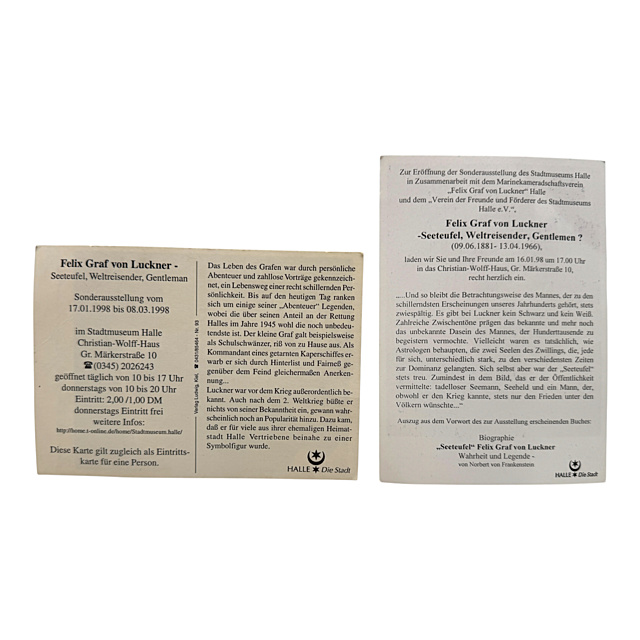 Bitte besichtigen. Felix Graf von Luckner, ein Offizierssohn aus Sachsen, erlangte als Kommandant des Segel-Hilfskreuzers SMS „Seeadler“ im Ersten Weltkrieg weltweite Berühmtheit. Zwischen 1916 und 1917 kaperte er im Atlantik und Pazifik zahlreiche feindliche Handelsschiffe. Sein legendärer Ruf als „Seeteufel“ gründete sich auf seinem seemännischen Geschick, seinem Mut und einer stets ritterlichen und fairen Behandlung seiner Gegner, die unnötiges Blutvergießen vermied. Nach dem Krieg war er als erfolgreicher Buchautor und Vortragsreisender international tätig und setzte sich für die Völkerverständigung ein. Seine größte und heldenhafteste Tat vollbrachte Graf von Luckner jedoch am Ende des Zweiten Weltkriegs für seine Wahlheimat Halle. Im April 1945 stand die US-Armee vor den Toren der Stadt und drohte mit deren vollständiger Zerstörung durch einen massiven Bombenangriff, sollte sich die Stadt nicht ergeben. In dieser kritischen Situation erklärte sich der damals 64-jährige Luckner bereit, als Vermittler zu fungieren. Aufgrund seines hohen Ansehens bei den Amerikanern, das er sich durch seine humane Kriegsführung im Ersten Weltkrieg erworben hatte, war er der ideale Parlamentär. Gemeinsam mit weiteren mutigen Bürgern wie Major a. D. Karl Huhold überquerte er die Frontlinie und verhandelte die kampflose Übergabe der Stadt. Durch seinen persönlichen Einsatz gelang es ihm, die amerikanische Führung von der Sinnlosigkeit einer Bombardierung zu überzeugen und eine friedliche Kapitulation zu erreichen. Diese mutige Handlung bewahrte Halle vor dem Schicksal vieler anderer deutscher Städte und rettete Tausenden das Leben. Für die Stadt Halle (Saale), wo sich Teile seines Nachlasses befinden, ist Graf von Luckner bis heute eine herausragende Persönlichkeit geblieben – eine Symbolfigur für Mut, Menschlichkeit und Völkerverständigung.