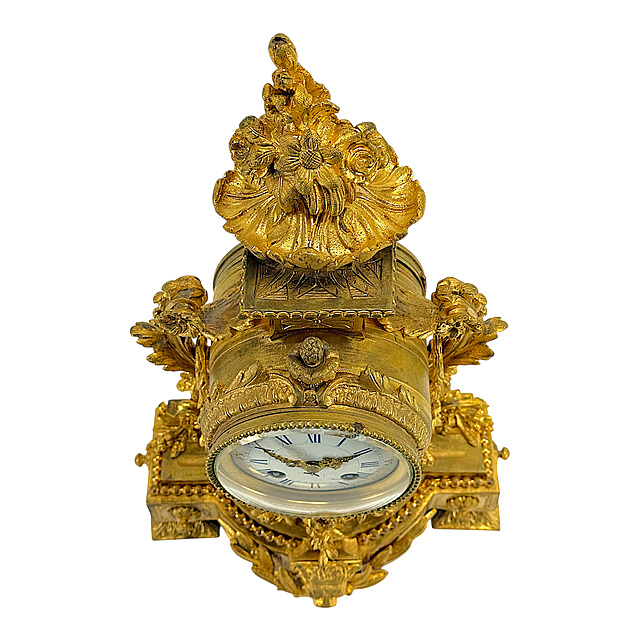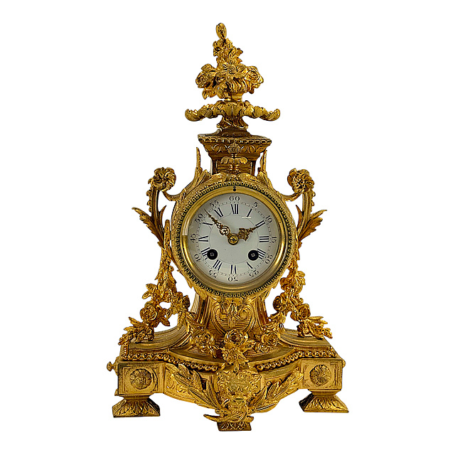 Bronze, fire-gilt, movement signed “A. Maurel Bordeaux”. An exceptionally splendid French mantel clock, crafted in the opulent Louis XVI style. The curved plinth on four decorated block feet is dominated on its facade by a central lion's mask with laurel leaves and is finished with a fine pearl frieze. Upon it rises the drum-shaped clock case, flanked by side scrolls with cascading, fully sculpted floral garlands. The white enamel dial displays Roman numerals for the hours and Arabic numerals for the minutes, framed in a bezel decorated with a pearl frieze. The pierced hands are also in the Louis XVI style. An architectural top with a lavish floral bouquet crowns the clock. Inside, a French round movement with spring suspension and half-hour strike on a bell is at work, its plate is hallmarked with the maker's name, key is present, good age-appropriate condition, The fire-gilding is well preserved and only partially somewhat rubbed. The movement is running. 38 x 23 x 13 cm (HxWxD)