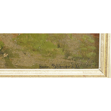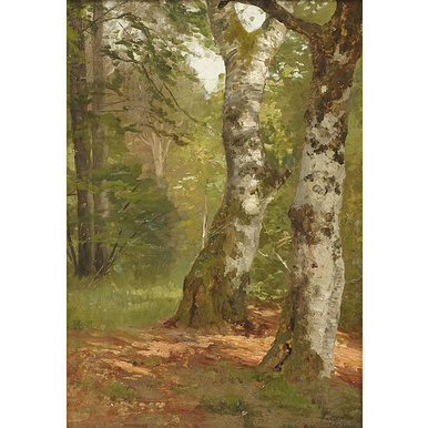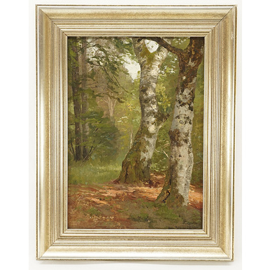(1852 - 1930 Düsseldorf), Öl/Maltafel, unten rechts handsigniert, um 1910, sehr nahsichtige Studie zweier Platanen im Wald- oder Parkgelände, restaurierter Zustand, kleinere Retuschen über älteren Farbausbrüchen und Kratzern, restaurierter Bruch des Malträgers in Bildmitte, insgesamt guter Eindruck, 45 x 32,5 cm (HxB), silberfarbener Rahmen, Rahmenbreite 6 cm
