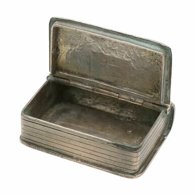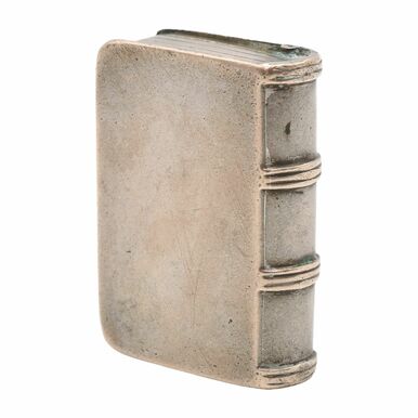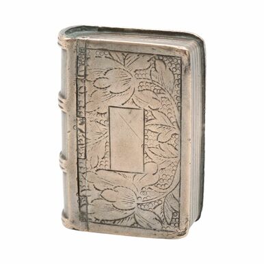 Silber (geprüft), innen gepunzt mit drei verschlagenen chinesischen Punzen, Miniatur-Unbuch als Dose mit scharniertem Deckel, vorderer Einband mit feiner floraler Gravur sowie freier Kartusche für Besitzermonogramm, altersgemäßer, gebrauchter Zustand, 4,2 x 3 x 1,3 cm (HxBxT), 29 g