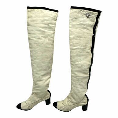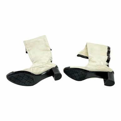 Größe 37, cremefarbenes Leder, schwarzes Lackleder, Sohlen geprägt mit Logo und "Made in Italy", gesticktes Logo oben am Schaft, Damenstiefel, Vintage, hoher, flexibler Schaft in cremeweißem Leder, die Kappen, die Rückseiten und der Blockabsatz mit schwarzem Lackleder abgesetzt, aus der Herbst/Winter Kollektion "Runway Ready-to-Wear" 2006/2007, altersgemäßer, gebrauchter Zustand, leichte Verfärbungen, partiell fleckig, Absatz H. 5 cm, Schaft H. 59 cm
