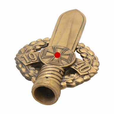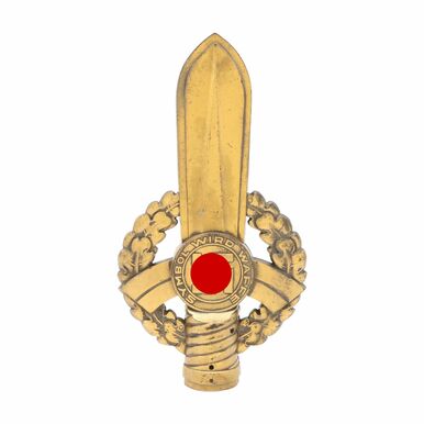 Kunststoff gegossen, bronzefarben gefasst, die Spitze als Dolch im Eichenlaubkranz gearbeitet, auf den Seiten ein Eisernes Kreuz mit der Jahreszahl 1940 und HK bzw. ein Medaillon mit HK und der Inschrift: SYMBOL WIRD WAFFE, der Dolchgriff fest als Tülle für die Fahnenstange gearbeitet, altersgemäß gute Erhaltung, H. 25 cm