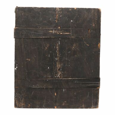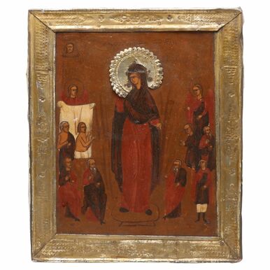 auch "Aller Bedrängten Freude" oder "Helferin der Leidenden", aus zwei Holzbrettern gefertigtes Bildfeld, zwei Rückseiten-Sponki, Levkas, Eitempera auf Kreidegrund, der Rand ist von einer Basma bedeckt, im Zentrum ist die übergroße Mutter Gottes dargestellt (Nimbus / Heiligenschein mit Oklad / Riza bedeckt bzw. verziert), links und rechts von ihr zwei Schutzengel, darunter sind die Nackten, Kranken und Armen dargestellt, die zur Gottesmutter beten, ganz oben links ist Jesus Christus, altersgemäßer Zustand, teilweise minimal berieben, Oklad-Oberflächen korrodiert, 31 x 26 cm (HxB)
