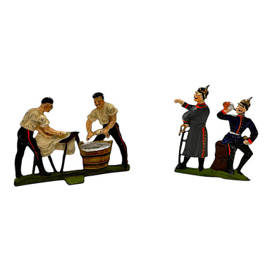 Bemaltes Zinn, beidseitig von Hand koloriert, Konvolut aus insgesamt 15 flachen Zinnfiguren, teils Figurengruppen, Darstellung verschiedener militärischer Szenen und Lagermotive, darunter berittene Musiker in Paradeuniform, Trommler, Fahnenträger, Offiziere in Pickelhauben, Lagerfeuer-Szene, Verwundetenversorgung durch Sanitätspersonal, sowie Waschszenen und Soldaten im Biwak, farbkräftige Staffierung mit hoher Detailtreue, typisches Thema der deutschen Zinnfigurenproduktion in der Tradition des 19. Jh., altersgemäß guter Zustand mit kleinen Farbabplatzungen, Figurenhöhe ca. 5,5–10 cm