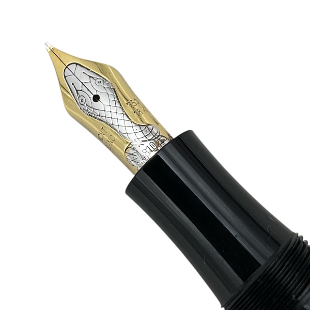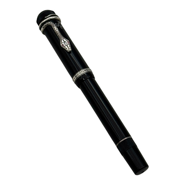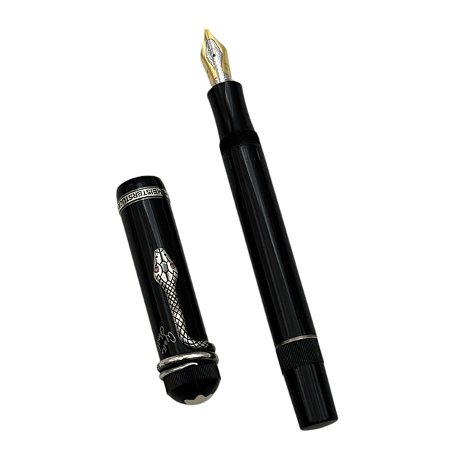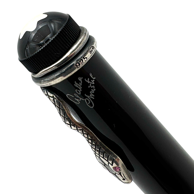 schwarzes Edelharz, 925/- Silber, Die Gestaltung des Kolbenfüllhalters greift mit dem geschmeidig gewundenen Schlangenclip mit zwei Rubinen als Augen die mystische Symbolik der berühmten Kriminalschriftstellerin auf, während das tiefschwarze Harzgehäuse mit der faksimilierten Signatur „Agatha Christie“ und den Silberdetails höchste Eleganz ausstrahlt. Das luxuriöse Schreibgerät trägt eine eingeprägte Limitierungsnummer an der Kappe "29920/30000". Die Schreibfeder aus 18 Karat Gold (750/-) greift das Schlangenmotiv der Kappe auf und ist geprägt mit "Montblanc 4810 750 18 K". Die Silberpunze "925" befindet sich am Dekor der Kappe, altersgemäß guter Zustand, mit leichten Gebrauchsspuren, ohne Originalbox oder Papiere, L. 14,3 cm