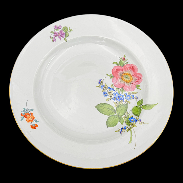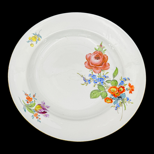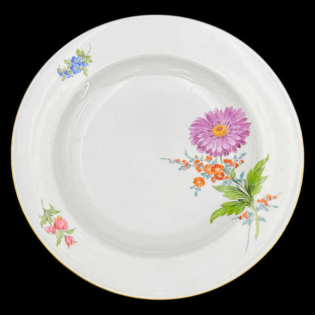 Porzellan, glasiert, zwei Schleifstriche, im Boden Knaufschwerter, mit farbenfrohen Blumenmalereien, darunter Rosen, Astern, Vergissmeinnicht und Tulpen, teils mit kleineren Streublümchen am Fahnenrand, altersgemäßer Zustand, Brandfehler, Spannungsrisse, Randunebenheiten, 3 x 23,5 cm (HxD)