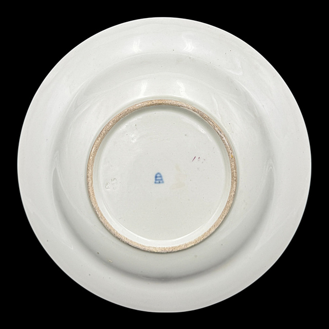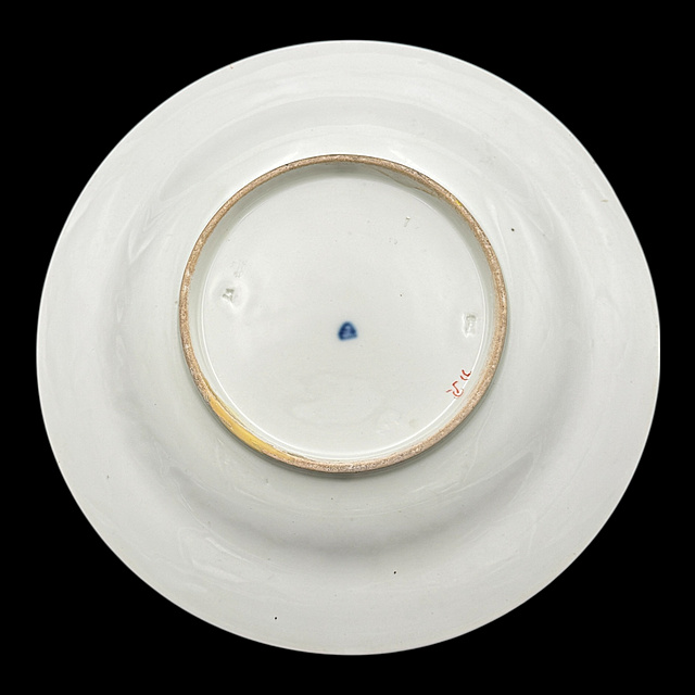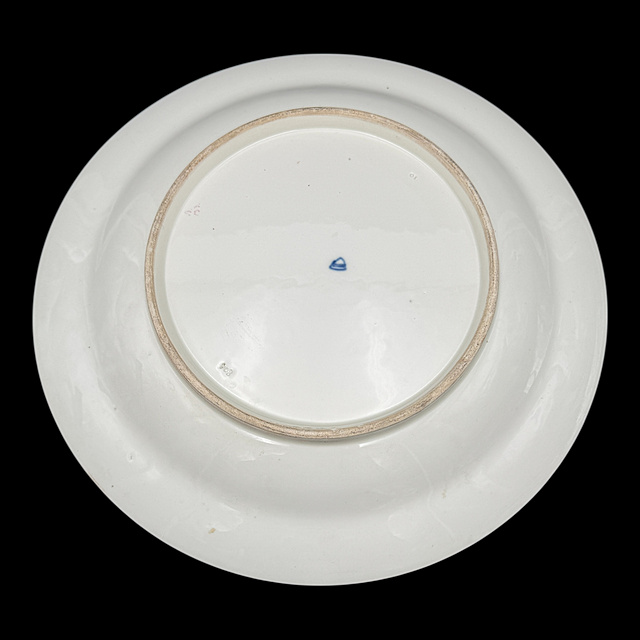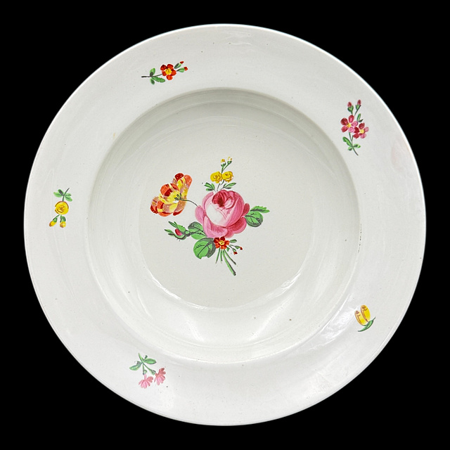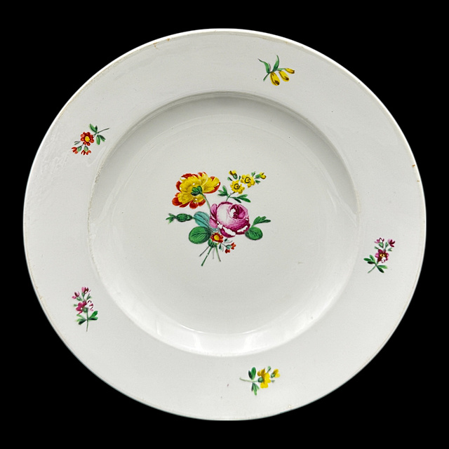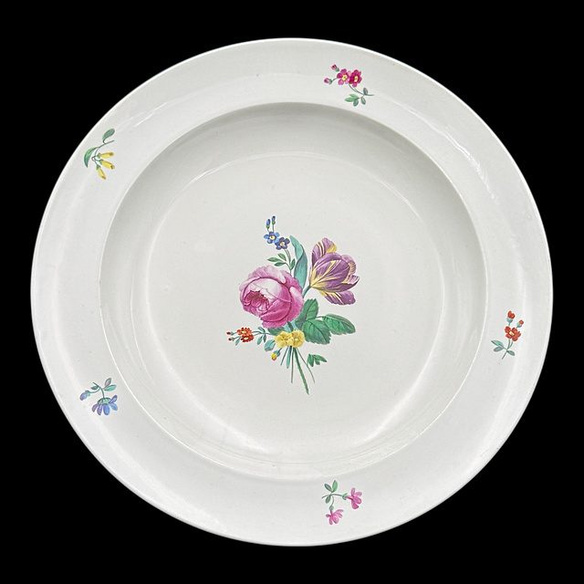 Porzellan, 18. Jh., im Boden gemarkt, altersgemäßer Zustand 1) Großer Anbietteller, zentrale florale Komposition, ergänzt durch Streublumen am Fahnenrand, 5 x 34 cm (HxD) 2) Flacher und tiefer Essteller, zentral fein ausgeführtes florales Motiv, Rand mit bunten Streublumen, leichte Gebrauchsspuren, Dekorabrieb und minimale Brandfehler, D. ca. 25 cm