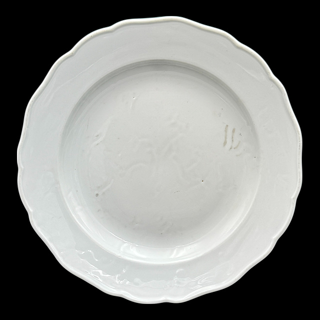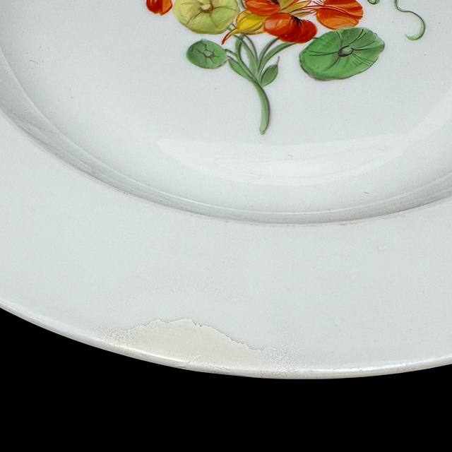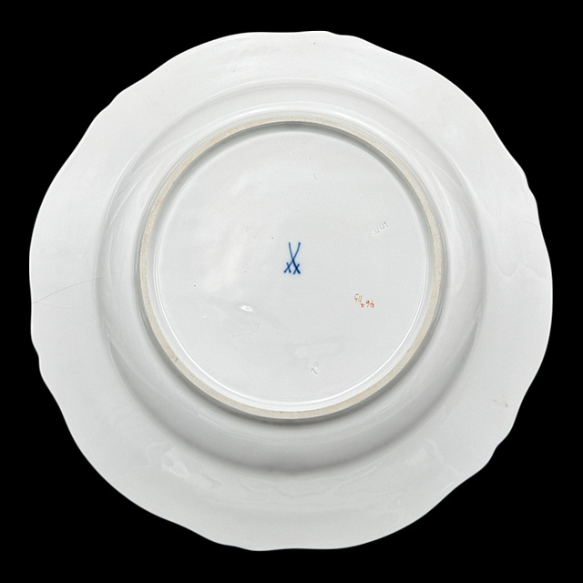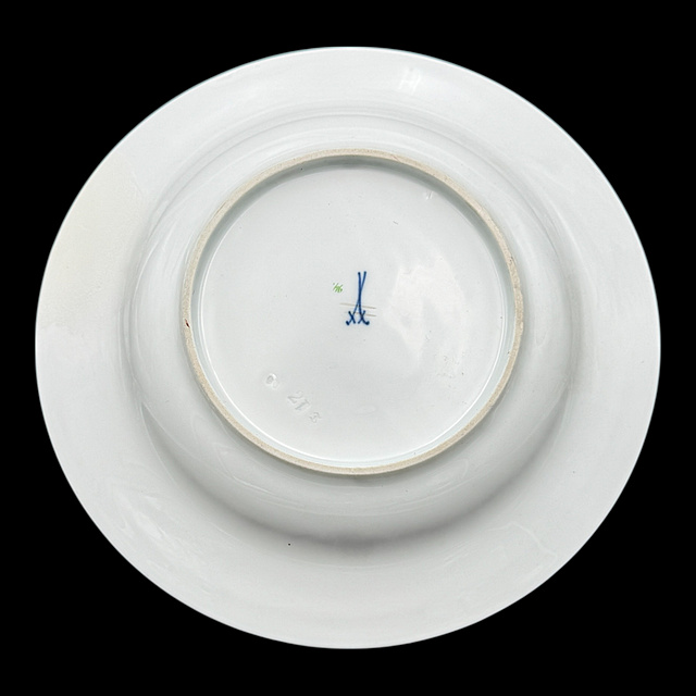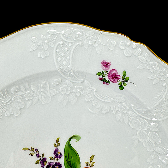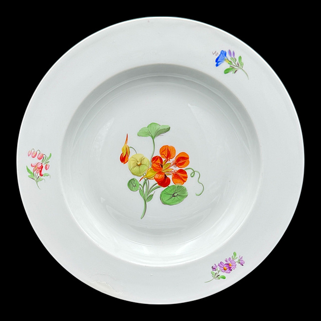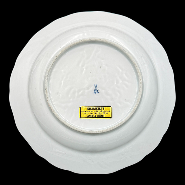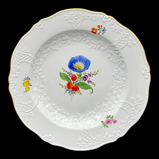 Porzellan, im Boden Schwertermarke, altersgemäßer Zustand 1) Teller mit Blumenmalerei, 1815 - 1923, zwei Schleifstriche, fein ausgeführte, farbintensive Blumenmalerei in der Spiegelmitte, ergänzt durch Streublumen auf dem Fahnenrand, mit restaurierter Randstelle, D. 24,5 cm 2) Teller mit Blumenmalerei, 20. Jh., 1. Wahl, zentrales, farbenfrohes Blumenbukett im Spiegel. Der Rand ist dezent reliefiert und mit floralen Streublumen versehen, Spannungsriss und kleiner Chip, D. 25 cm 3) Speiseteller, 19. Jh., vier Schleifstriche, Weißporzellan, starke Glasurfehler, D. 24 cm