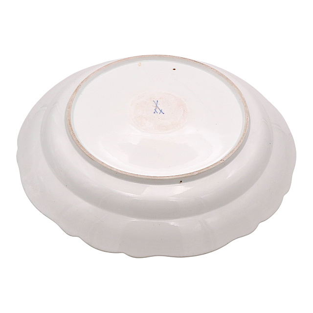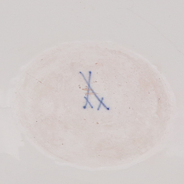 Porzellan, zwei Schleifstriche, im Boden Knaufschwerter, Der Teller zeigt eine fein von Hand gemalte Landschaftsszene mit Figuren am Wasser, architektonischen Elementen, Schiffen und Gebirgslandschaft im Hintergrund. Der Rand ist mit zarten Insektendarstellungen verziert und mit Eisenrot abgesetzt, altersgemäßer Zustand, Rand gerieben, Brandfehler, Glasur partiell krakeliert, 7 x 43 cm (HxD)