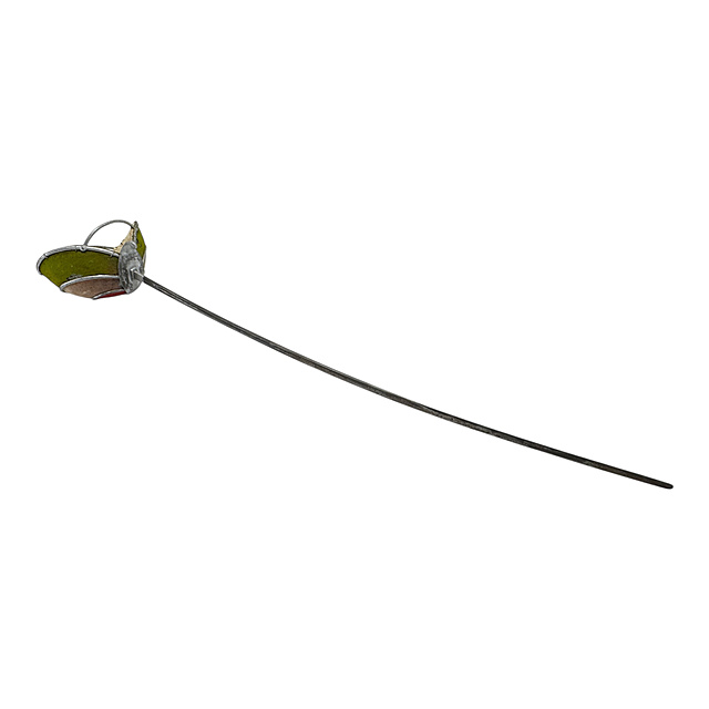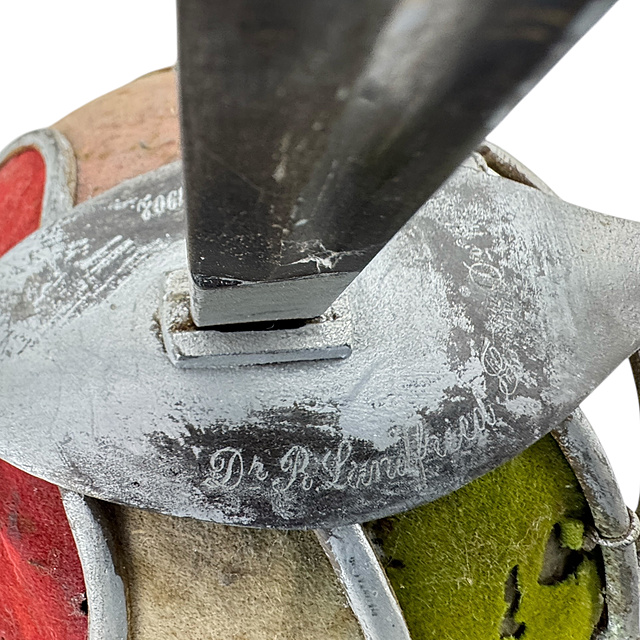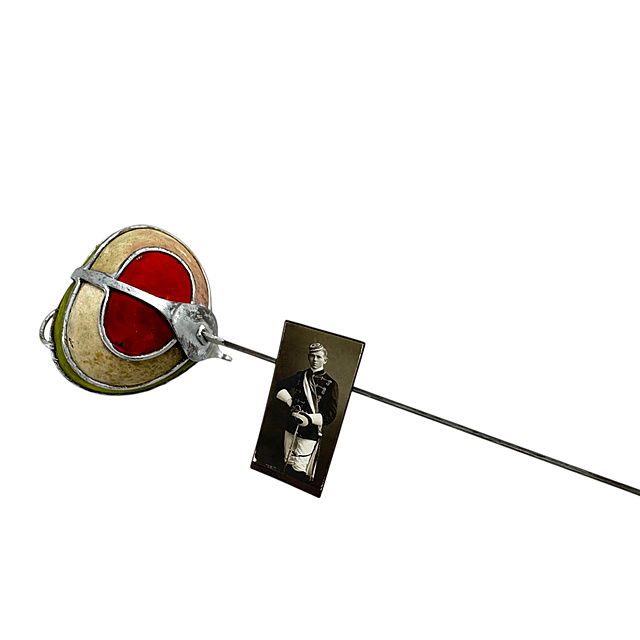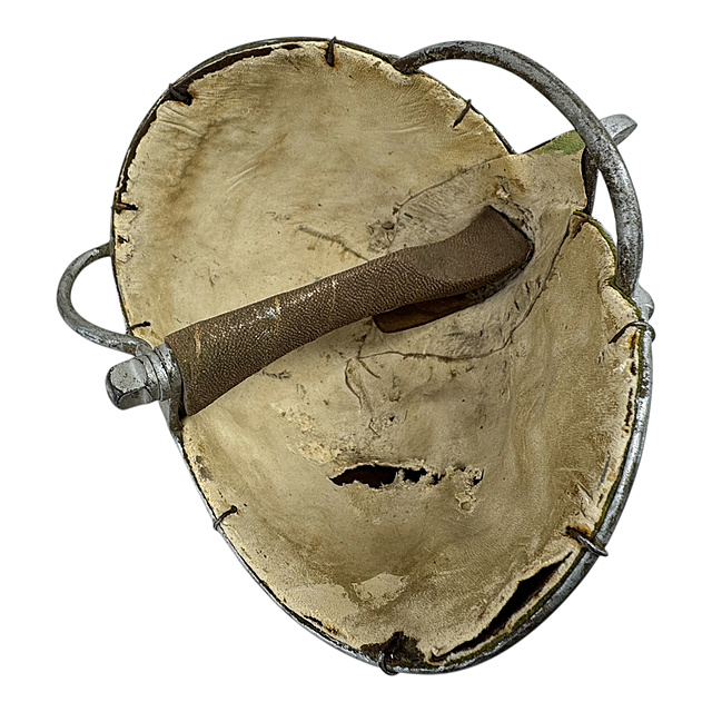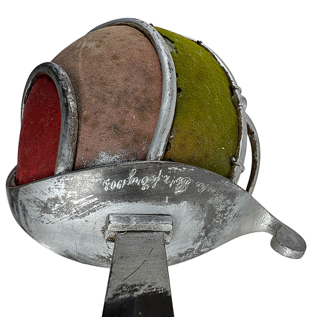 Stahl, Leder, Filz. Ein originaler Korbschläger für das studentische Fechten (Mensur), datiert durch eine Gravur auf dem Stichblatt auf das Jahr 1902. Der stählerne Korb ist innen mit einem Paukpolster aus Leder und Filz ausgekleidet, das die Couleur-Farben Rot-Weiß-Grün der Studentenverbindung zeigt. Der Griff ist mit einer braunen, strukturierten Wicklung versehen. Die lange, gerade Fechtklinge ist nicht geschärft. Der Schläger wurde zu einem späteren Zeitpunkt mit einer silbernen Farbfassung versehen. Dem Schläger ist eine zeitgenössische Fotografie eines Studenten in Uniform beigegeben, der vermutlich der ursprüngliche Besitzer war, altersgemäße Erhaltung, Paukpolster teilweise beschädigt, Gravur auf dem Stichblatt teilweise von Farbe freigelegt, L. 105 cm.