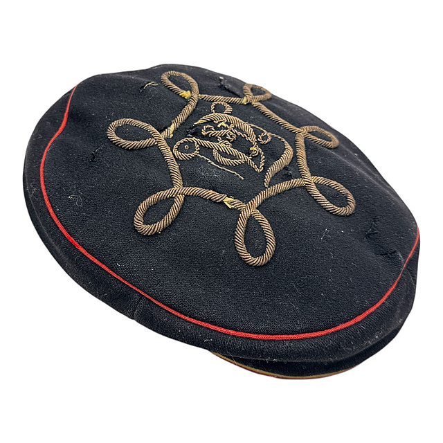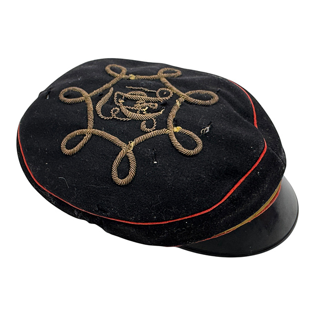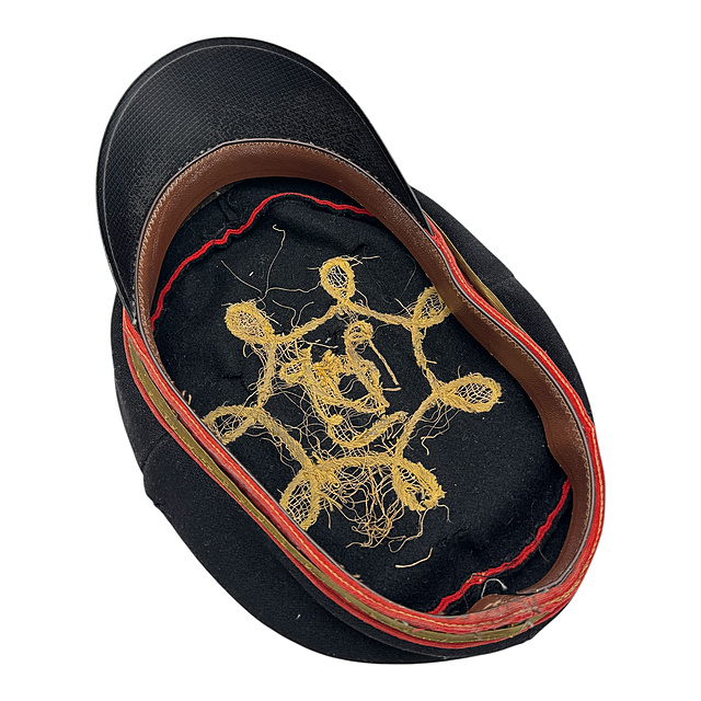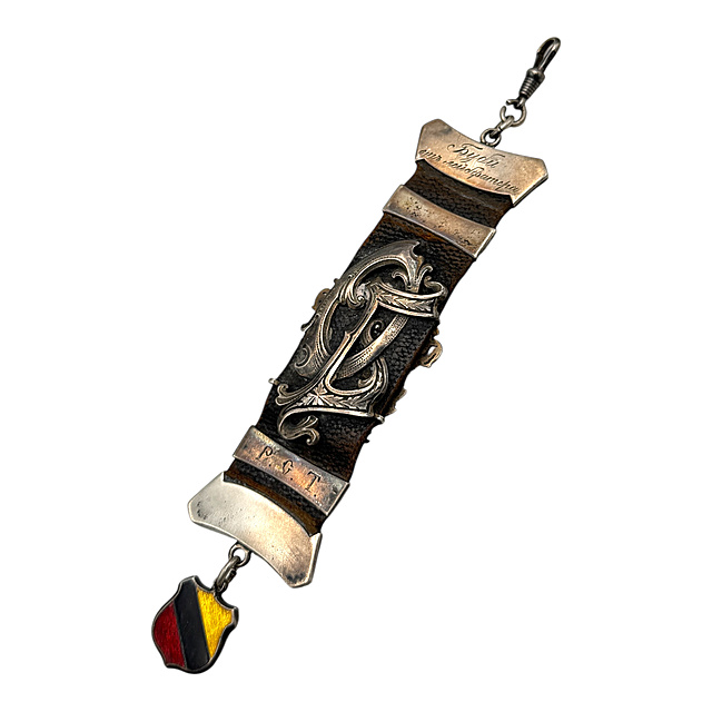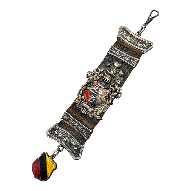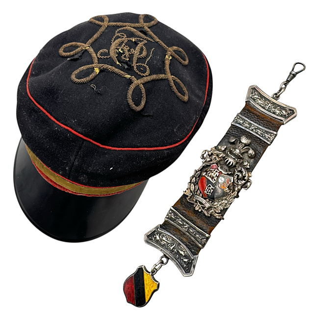 Ein seltenes und historisch bedeutsames Konvolut der russischen Studentenverbindung Fraternitas Arctica aus Riga. 1) Studentische Tellermütze: Schwarzer Wollstoff mit rot-goldenem Band und schwarzem Lackschirm. Die Mütze ist oben durchstochen, was auf die Teilnahme an einer Mensur (studentisches Fechten) hindeutet. Auf dem Deckel ist eine aufwendige, goldene Kordelstickerei in Form des Verbindungszirkels angebracht. 2) Großer Bierzipfel: Ein prunkvoller Anhänger, bestehend aus einem breiten Lederband mit aufwendigen Silbermontierungen. Das zentrale, emaillierte Wappen zeigt den Heiligen Georg, Globus und ein Schiff und den Zirkel der Verbindung. Darunter befindet sich die Abkürzung des Wahlspruchs P.C.T. (Rci slovo tvjordo), "Ein Mann, ein Wort" sowie das Gründungsdatum 1880. Unten verziert mit einem emaillierten Anhänger in den Verbindungsfarben Gold-Schwarz-Rot. Die Rückseite einer der Montierungen trägt eine Widmung in kyrillischer Schrift und ein großes Monogramm. Beide Stücke in altersgemäß gutem, getragenem Zustand mit authentischer Patina, Länge des Bierzipfels 17,5 cm.