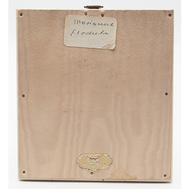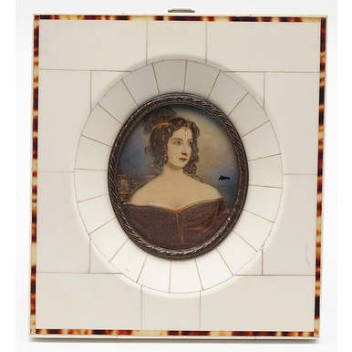 Ivory miniature of Marianna Marchesa Florenzi, ouache, indistinctly signed on the right edge, 20th century, inscribed on the reverse, oval portrait with brass bar set off from the rectangular frame in ivory, good condition, image 6 x 5 cm (HxW), total dimensions 13.5 x 12 cm (HxW)