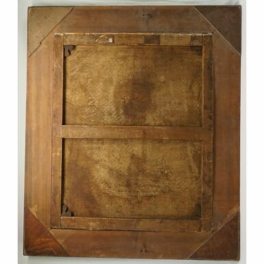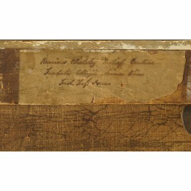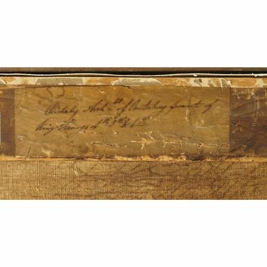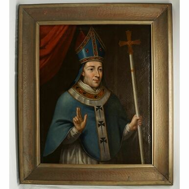 Oil on canvas, unsigned, circa 1810, rear labeled and titled multiple times on handwritten labels, life-sized portrait of the historically most famous Archbishop of Canterbury, inquisitor, and founder of All Souls College at the University of Oxford, Chichele survived three reigns from Henry IV to Henry VI during his tenure, ruled ruthlessly at the helm of the Anglican Church, and propagated his rise from poverty to the highest ecclesiastical office in Britain as a model for the faithful; the source for this portrait was an engraving by E. Brayley (publ. 1806 in London) after a portrait of the Archbishop from the 15th century, which is located in Lambeth Palace, the Archbishop's residence for stays in London; the Latin inscription attached to the engraving at the top and bottom of the image was handwritten on a label here and attached to the stretcher together with an English translation; the depiction of the Archbishop differs in the colors of the vestments from the original painting, suggesting that the author of this depiction only knew the engraving, blue is used here as the color of the vestments, which is the heraldic color of the jurisdiction of the Archbishopric of Canterbury, the decorative elements have been slightly altered, and the bishop's staff is not quite accurately rendered, overall, the portrait conveys a reverent, uncritical image of Chichele in high artistic quality, age-appropriate good condition, restored, edge doubled, fine craquelure network, overall, qualitatively restored, hand-carved wooden frame, age-appropriate good condition, frame width 16 cm, 102 x 83 cm (HxW).